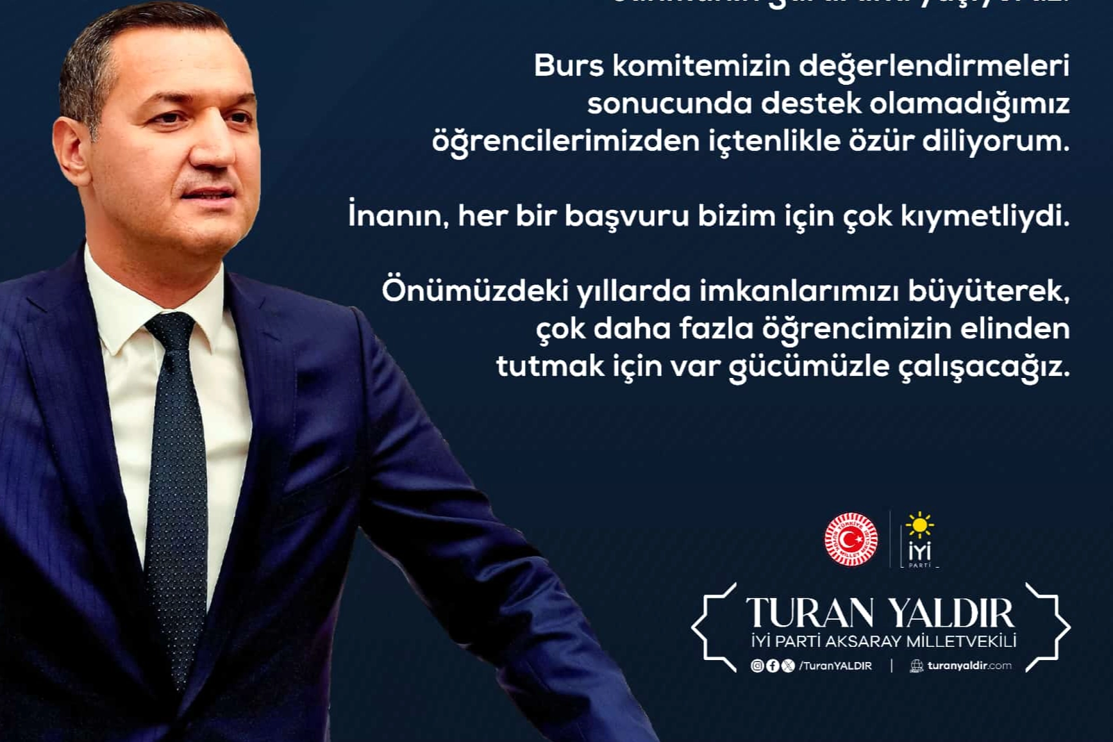 İYİ Parti Aksaray Milletvekili Turan YALDIR, milletvekili maaşının tamamı, şirketinden oluşturduğu kaynak ve hayırsever dostlarının desteğiyle kurulan burs fonu aracılığıyla bu yıl 400 öğrenciye aylık 2.500 TL burs verileceğini açıkladı.