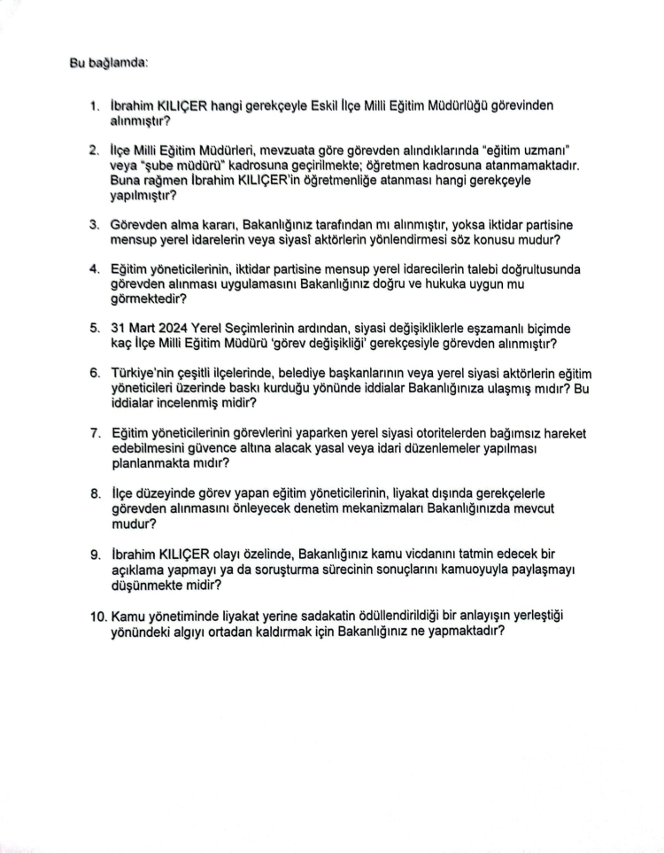 Olay, özellikle kamu kurumlarında görev yapan yöneticilerin karar alma süreçlerinde karşılaştığı baskılar ve çalışma koşulları üzerine tartışmaları yeniden başlattı. TBMM’deki soru önergesinin ardından, Bakanlık yetkililerinin konuya ilişkin açıklama yapması bekleniyor.
