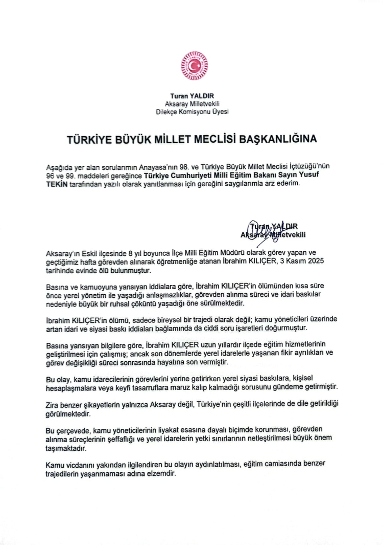 İyi Parti Aksaray Milletvekili Turan Yaldır, konuyu Meclis’e taşıyarak Milli Eğitim Bakanı Yusuf Tekin’in yanıtlaması istemiyle yazılı soru önergesi verdi. Yaldır, sosyal medya hesabından yaptığı açıklamada, “Bu olay, kamu yöneticileri üzerinde artan idari ve siyasi baskı iddialarını bir kez daha gündeme getirmiştir. Kamu vicdanını yaralayan bu hadisenin tüm yönleriyle aydınlatılması, benzer trajedilerin yaşanmaması için büyük önem taşımaktadır” ifadelerini kullandı.